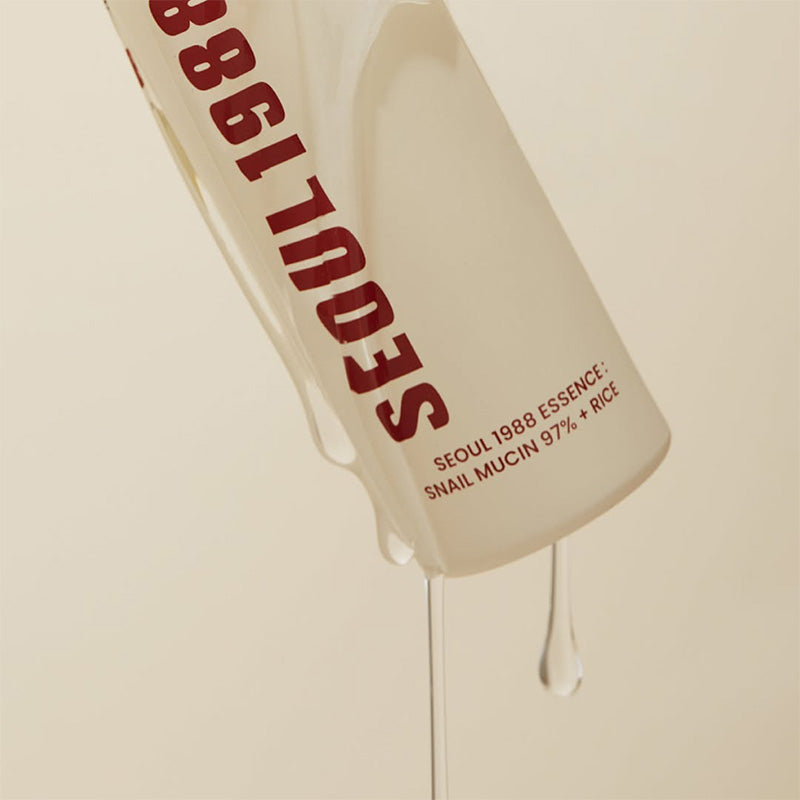 SEOUL 1988 Essence: Snail Mucin 97% + Rice Essence er en dybt fugtgivende og genopbyggende formel, der indeholder cirka 97% snegleekstrakt sammen med risbaserede ingredienser (frøekstrakt, risvand og risferment), som forbedrer hudtekstur, udstråling og fugtbevarelse. Den lette gel-lignende væsketekstur absorberes hurtigt, hvilket gør den egnet til alle hudtyper, inklusive sensitiv og hud, der er ramt af acne, samtidig med at den giver reparerende, beroligende og lysnende fordele.